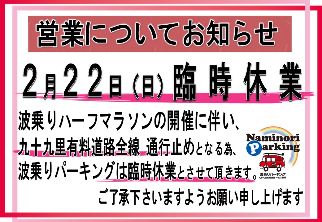 波乗りハーフマラソンの開催に伴い、2月22日(日)は波乗りパーキングを終日休館とさせていただきます。